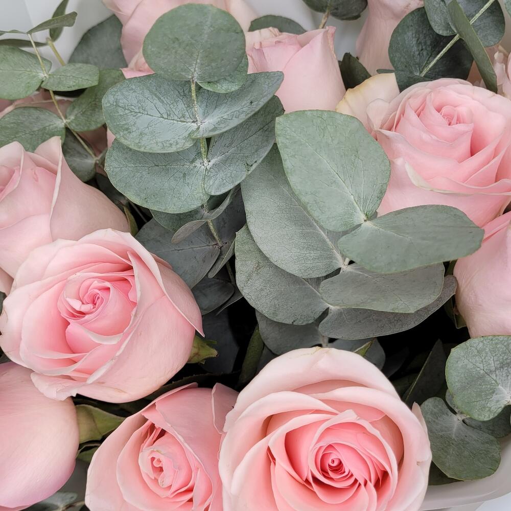 Роза Эквадор – 15 шт.Эвкалипт – 7 шт.Упаковка дизайнерская – 1 шт.Лента атласная – 1 шт.