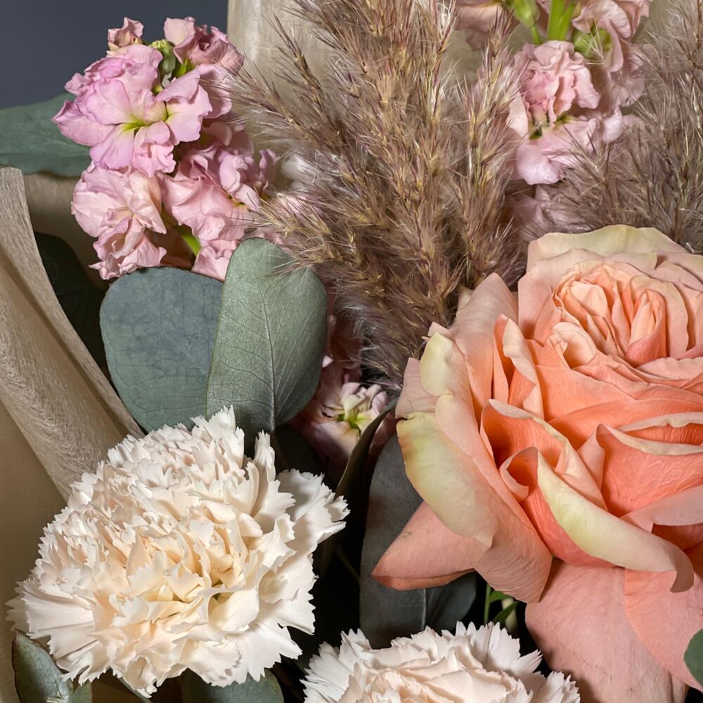 Лента – 2 шт.Маттиола – 3 шт.Эвкалипт – 2 шт.Роза одноголовая – 3 шт.Фисташка – 3 шт.Упаковка дизайнерская – 1 шт.Гвоздика одноголовая – 5 шт.камыш сухоцвет – 2 шт.