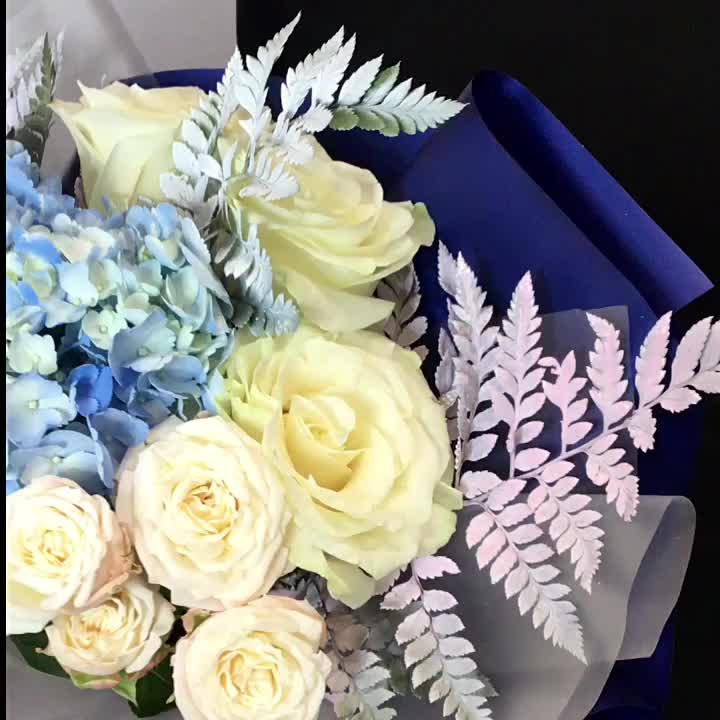 Кустовая роза – 1 шт.Лента атласная – 1 шт.Гортензия голубая – 1 шт.Лента органза – 1 шт.Роза Мондиаль Эквадор – 4 шт.Листья папоротника – 4 шт.Пленка дизайнерская – 2 шт.