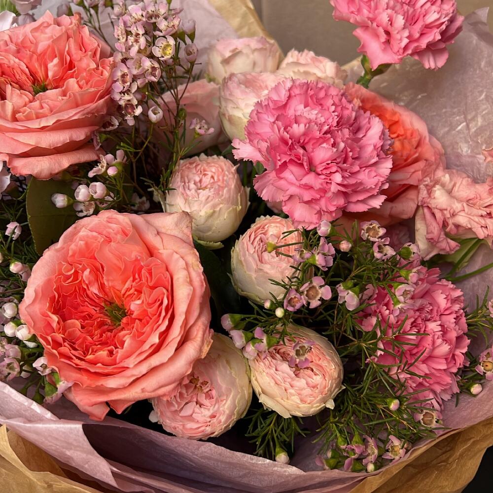 Пионовидная роза – 3 шт.Роза пионовидная кустовая – 2 шт.Гвоздика сортовая – 3 шт.Маттиола – 2 шт.Ваксфлауэр – 3 шт.Лизиантус – 1 шт.Упаковка дизайнерская – 1 шт.