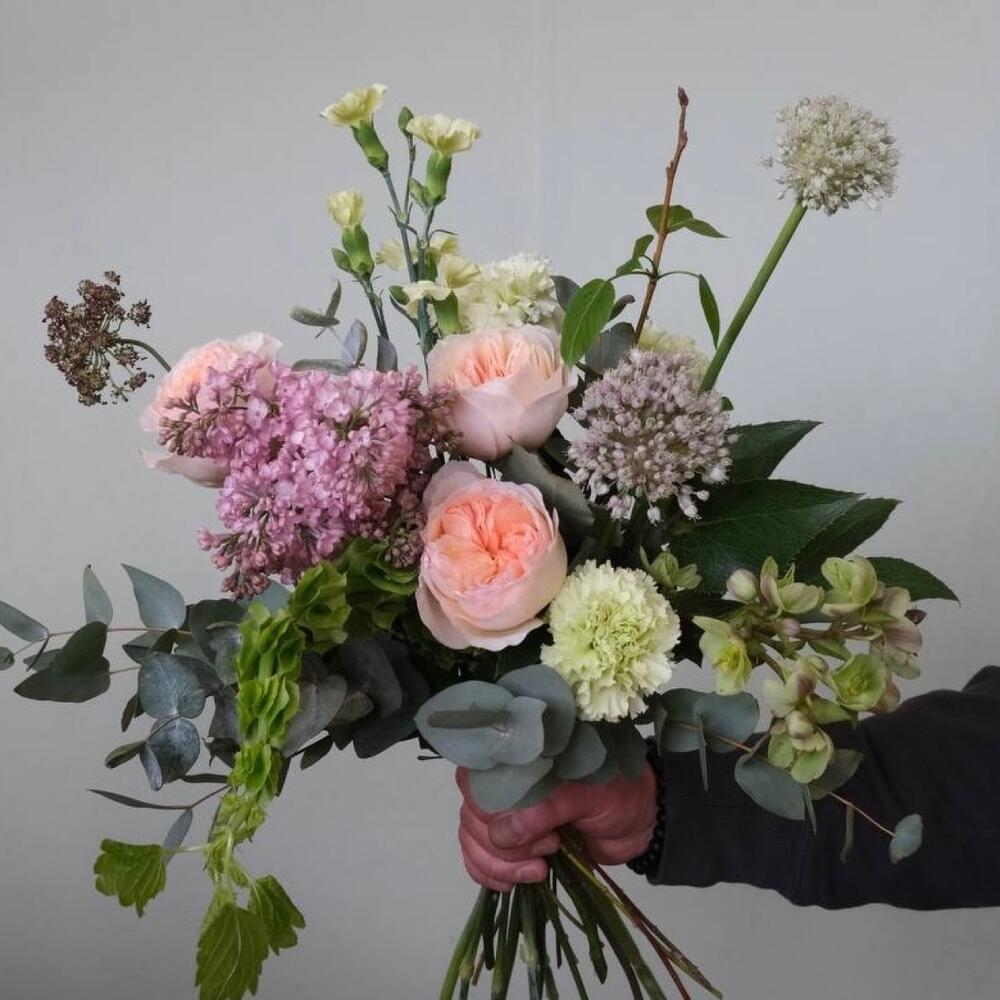Лента – 1 шт.Сирень – 1 шт.Эвкалипт – 5 шт.Гвоздика – 1 шт.Гвоздика кустовая – 2 шт.Роза пионовидная – 3 шт.Ветка – 3 шт.Морозник – 1 шт.лук полевой – 2 шт.ирландский колокольчик – 1 шт.морковка полевая – 1 шт.
