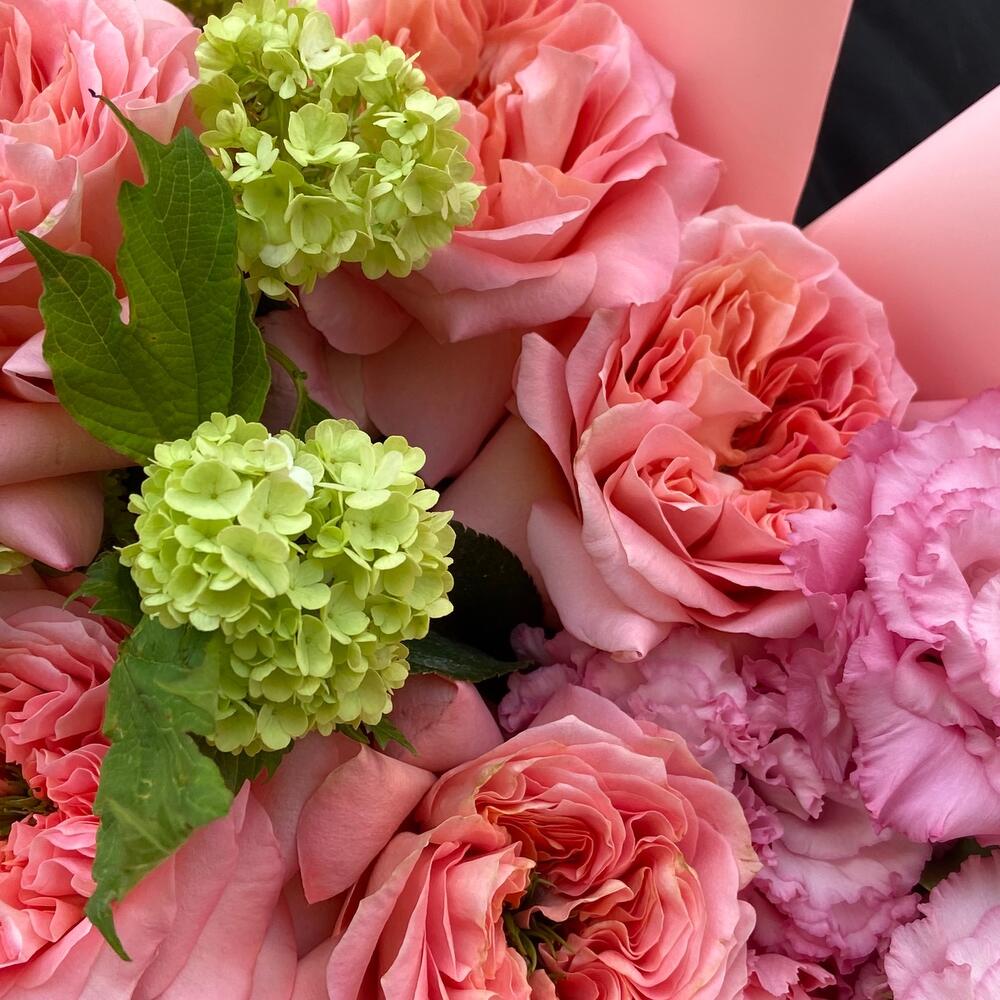 Вибурнум – 2 шт.Эустома – 2 шт.Лента атласная – 1 шт.Диантус – 3 шт.Упаковка дизайнерская – 1 шт.роза мандарин экспрешен – 5 шт.