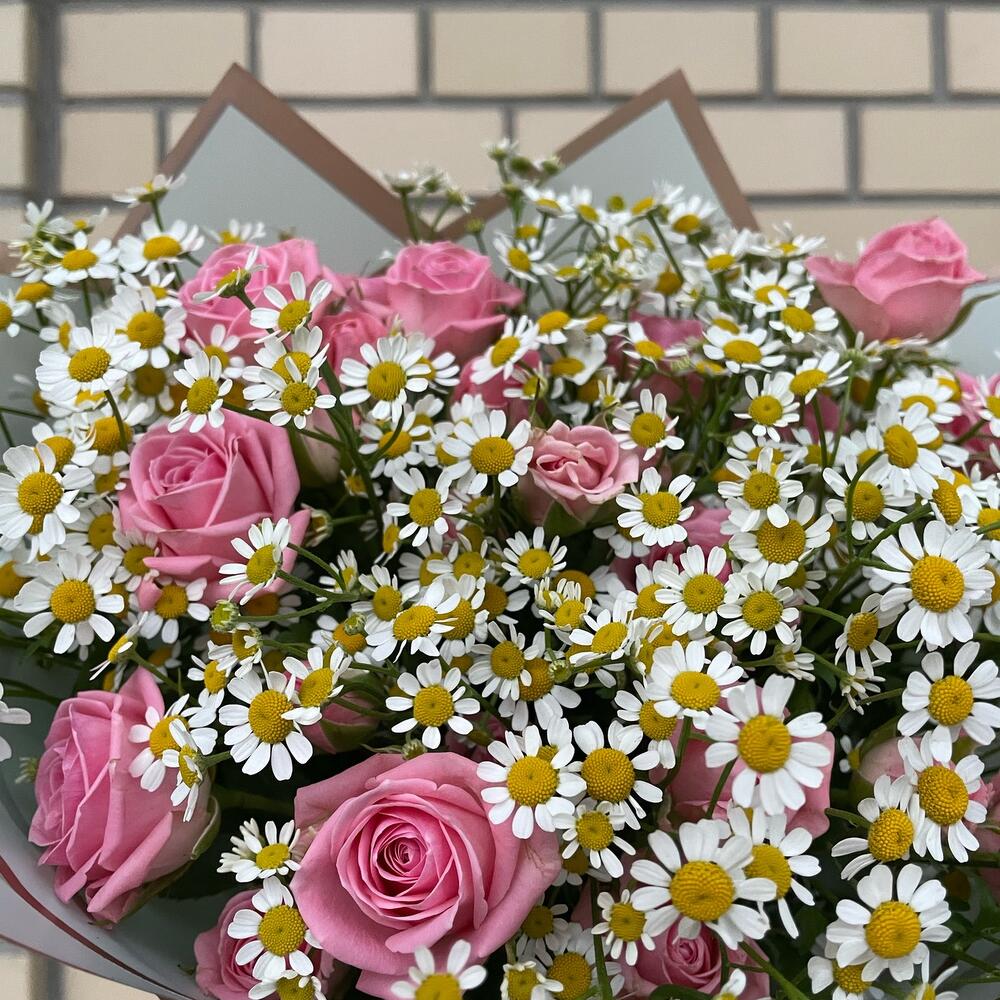 Роза кустовая – 5 шт.Матрикария – 10 шт.Упаковка дизайнерская – 3 шт.