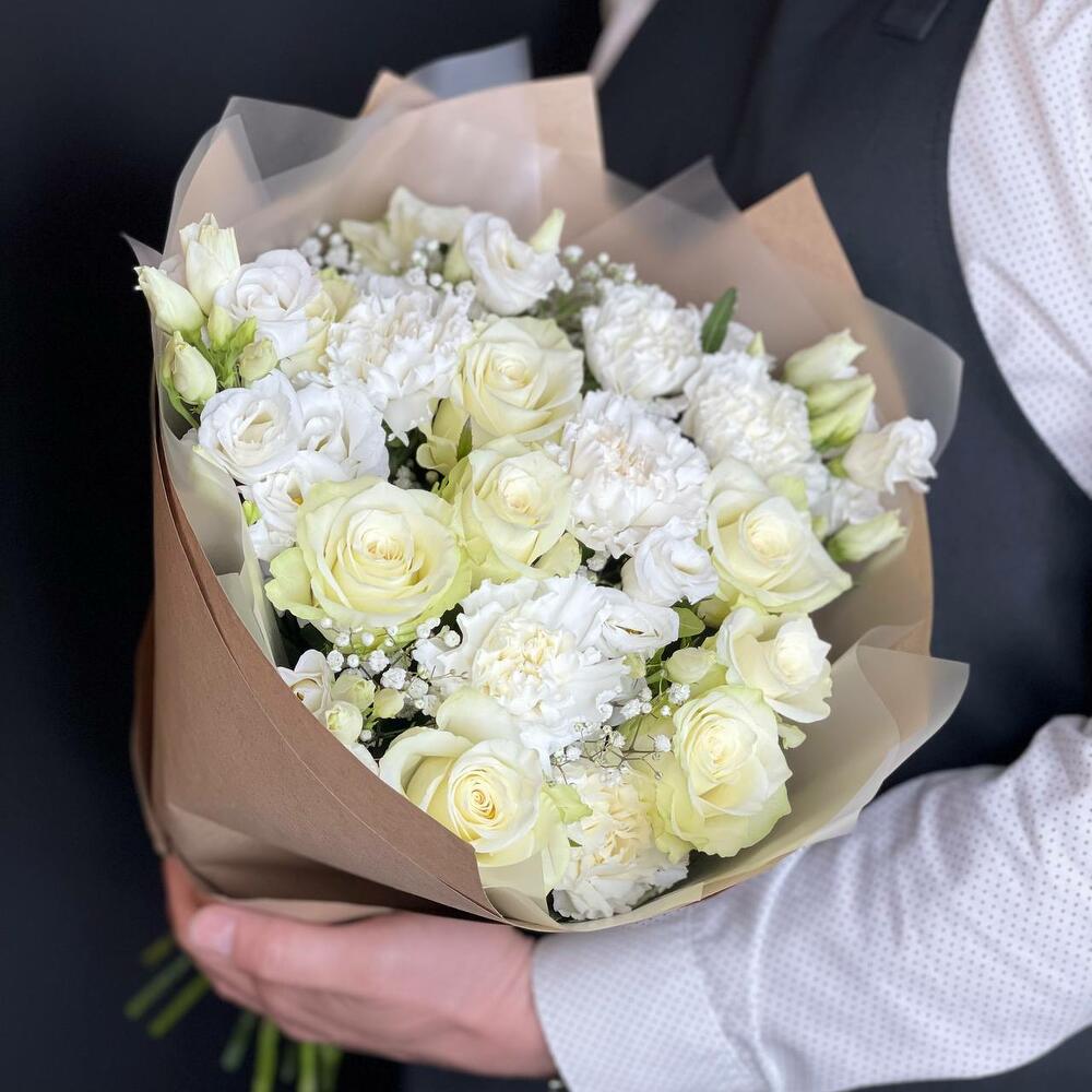 Гипсофила – 1 шт.Лизиантус – 2 шт.Роза – 9 шт.Диантус – 6 шт.Фисташка – 3 шт.Крафт – 1 шт.