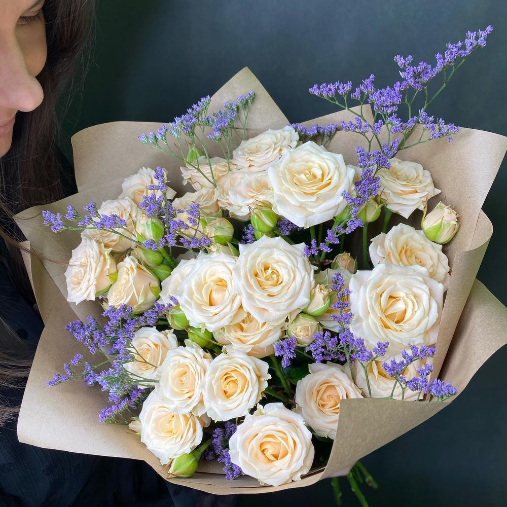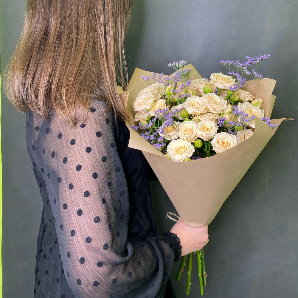 Роза кустовая – 5 шт.Джут – 1 шт.Крафт упаковка – 3 шт.Лимониум сиреневый – 2 шт.