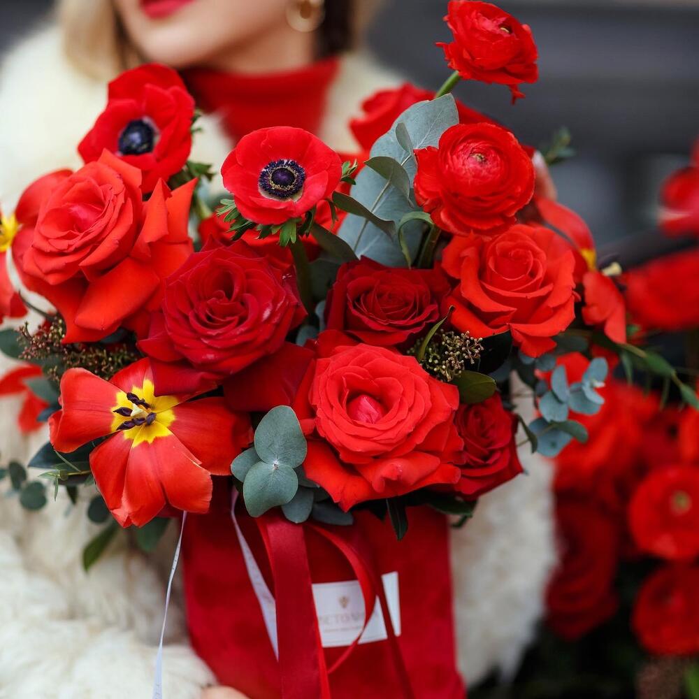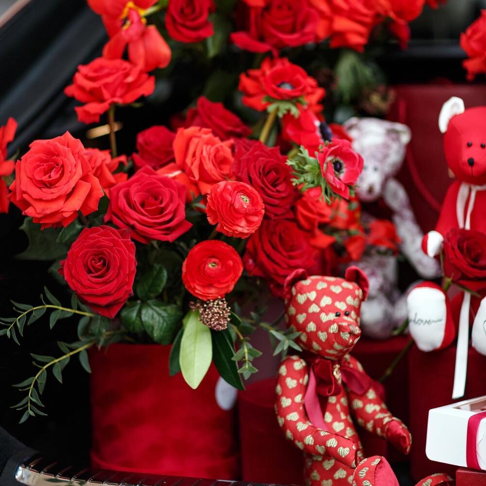 Коробка шляпная большая – 3 шт.коробка круглая бархатная – 3 шт.гирлянда «i love you” – 1 шт.Роза – 65 шт.Тюльпан – 15 шт.Ранункулюс – 10 шт.Эвкалипт Микс – 10 шт.Анемон – 10 шт.Зелень – 10 шт.премиальный медведь тедди – 2 шт.набор макарон 10 шт – 1 шт.