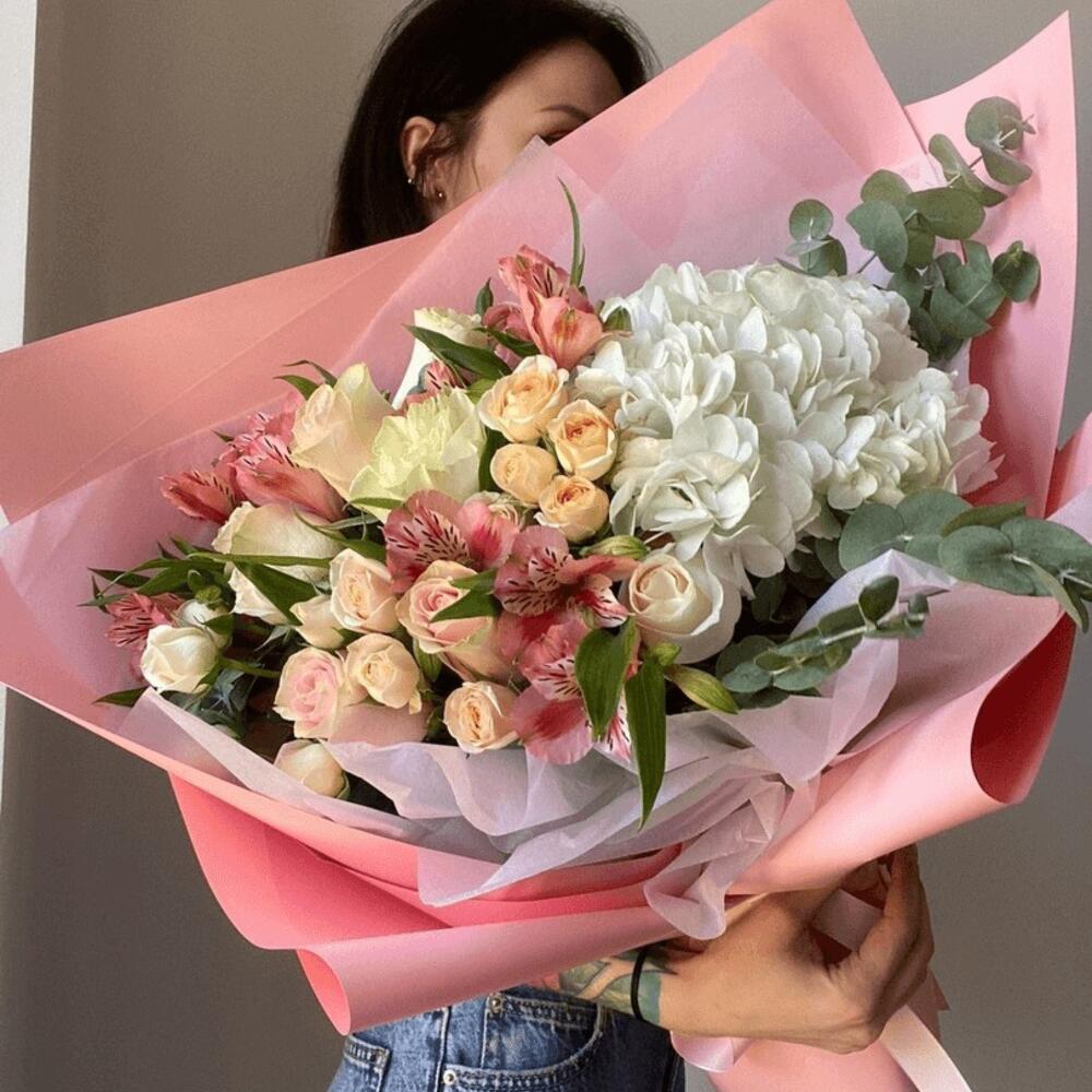 Альстромерии, Гвоздики, Кустовые розы, Лизиантусы, Розы, Хризантемы
