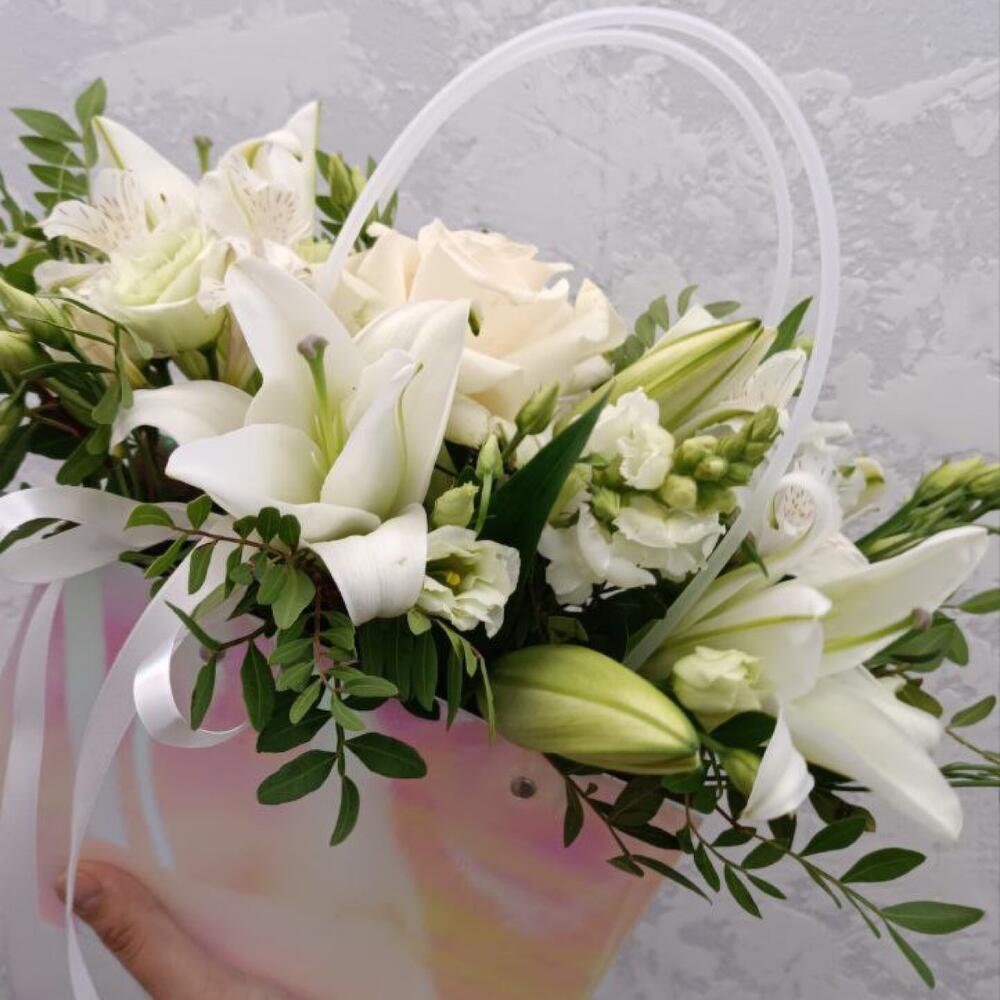 Альстромерия – 3 шт. Лилия – 1 шт. Писташ – 5 шт. Роза Эквадор – 1 шт. эустома белая – 3 шт. анирринум белый – 3 шт.