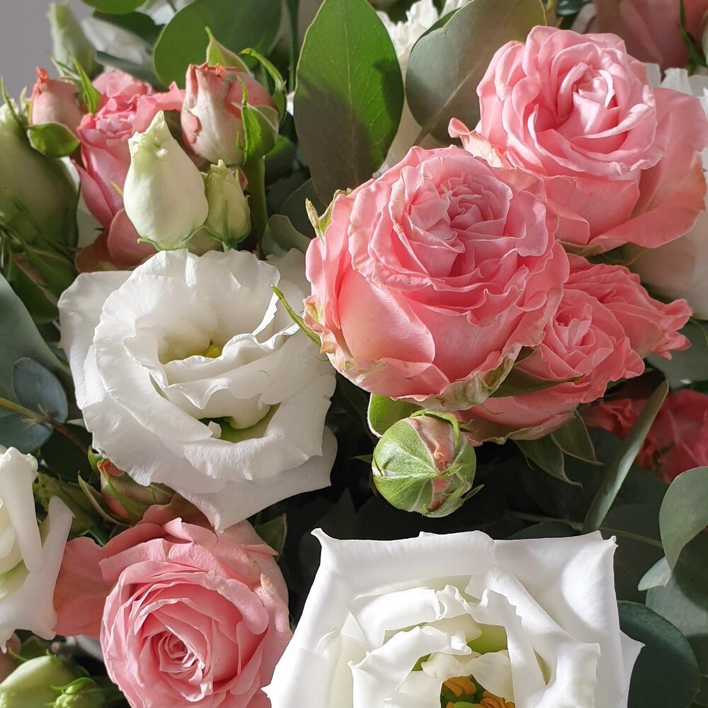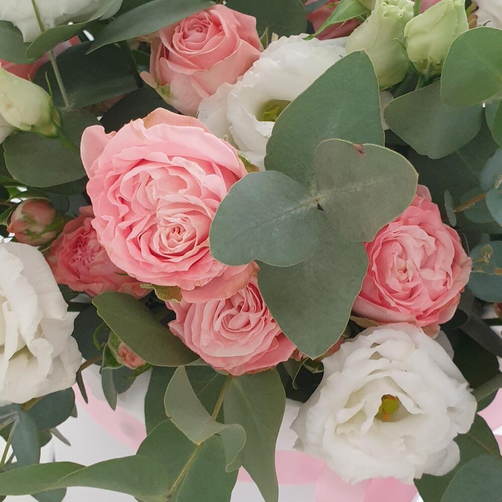 Цветы в коробке из кустовой розы, лизиантуса и эвкалипта