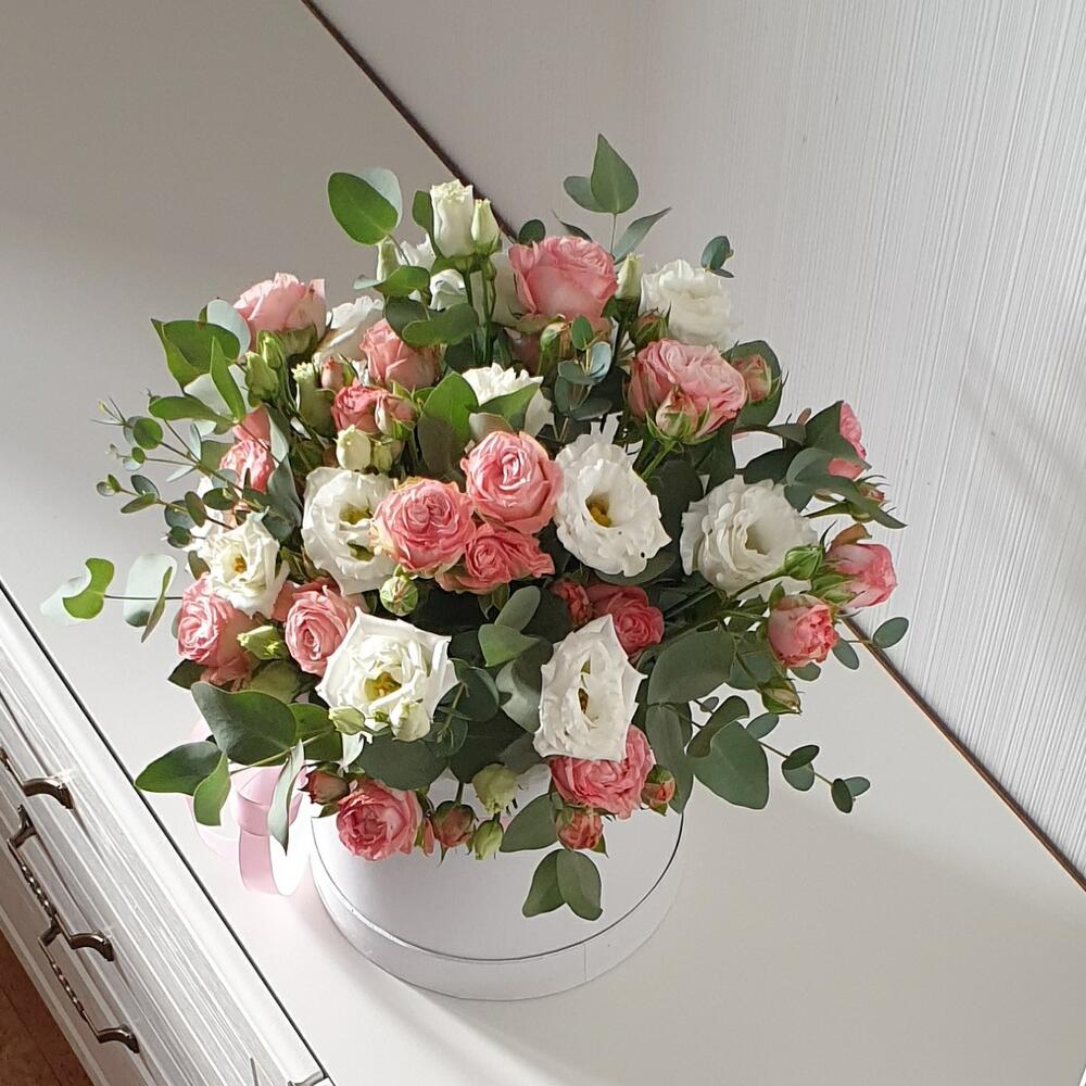 Нежная композиция в шляпной коробке из кустовой розы, лизиантуса и эвкалипта