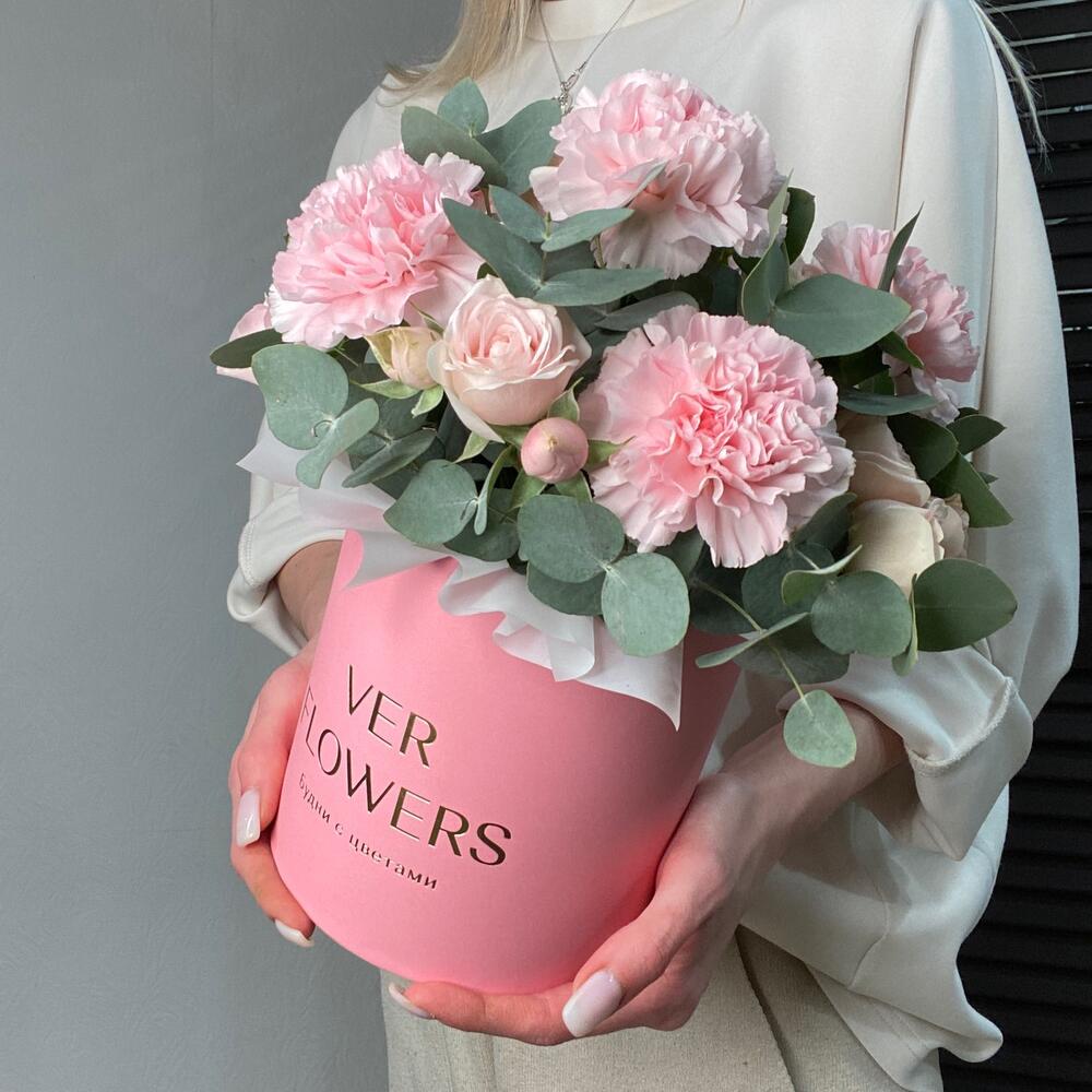 Кустовая роза – 3 шт.Диантус – 6 шт.Коробка – 1 шт.Оазис флористический – 1 шт.