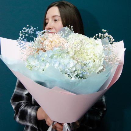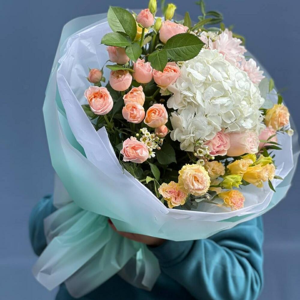 Гортензия – 1 шт. Лента – 1 шт. Хризантема кустовая – 1 шт. Эвкалипт – 3 шт. Эустома – 2 шт. Фисташка – 5 шт. Роза голландия – 3 шт. Упаковка дизайнерская – 7 шт. Роза пионовидная спрей – 3 шт.