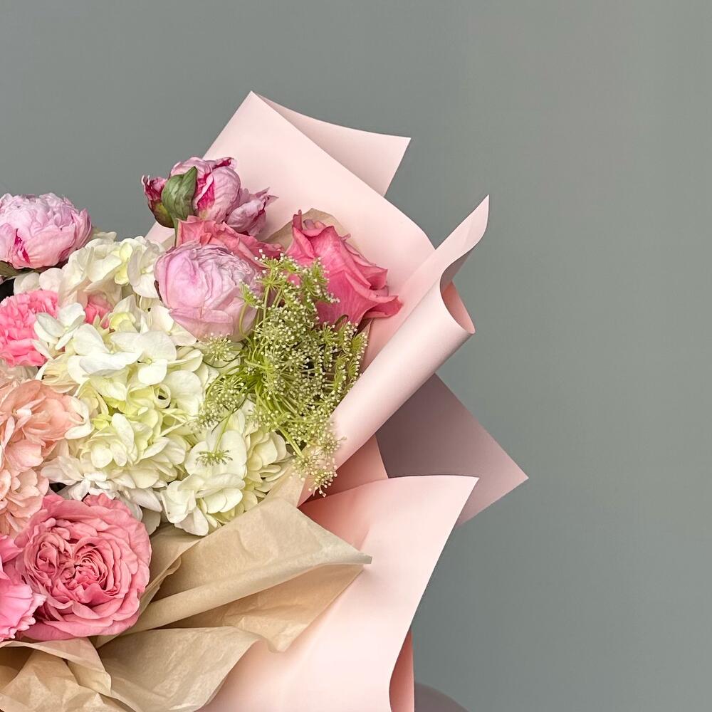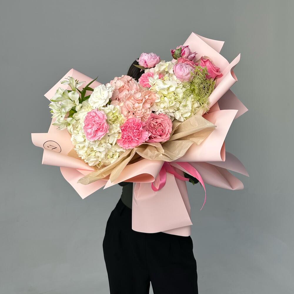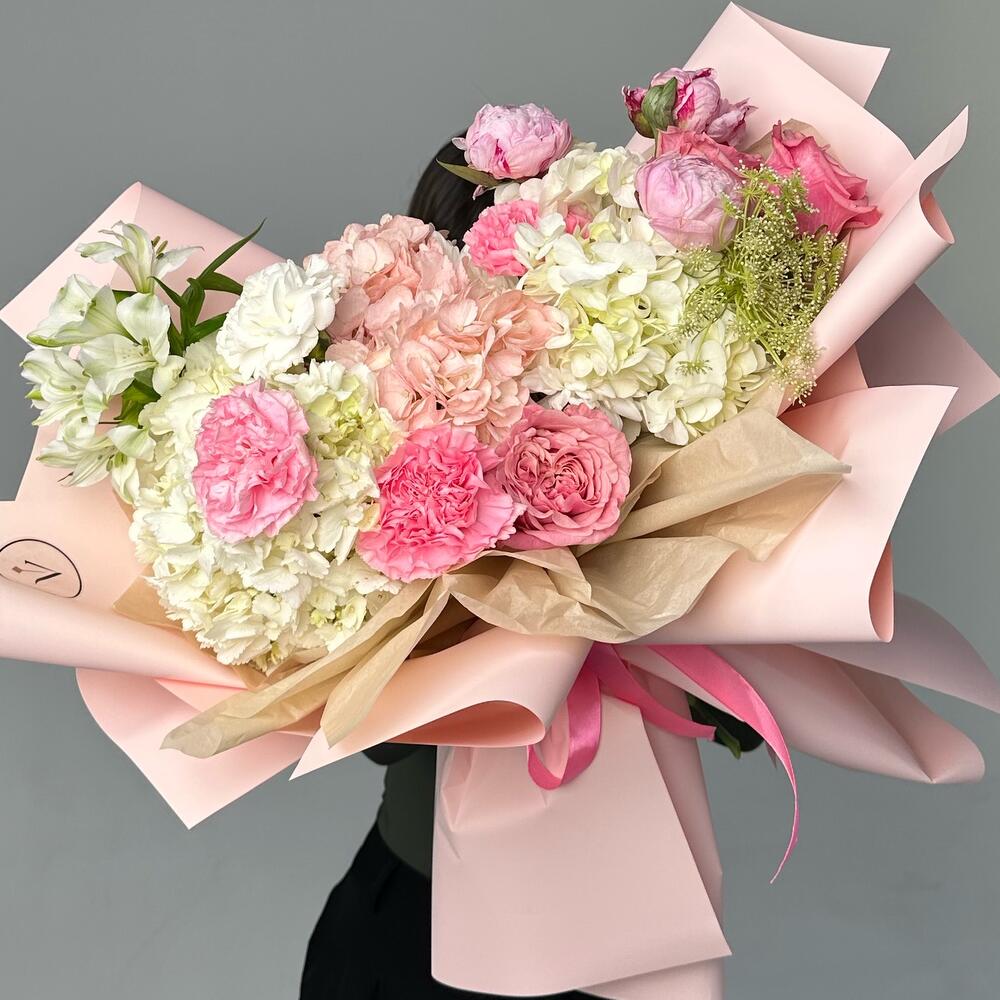 Гвоздики, Пионовидные розы, Розы
