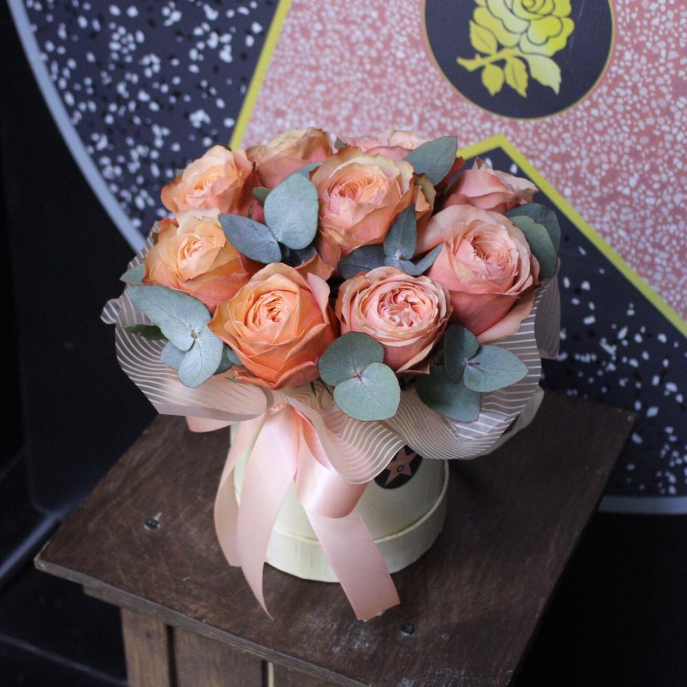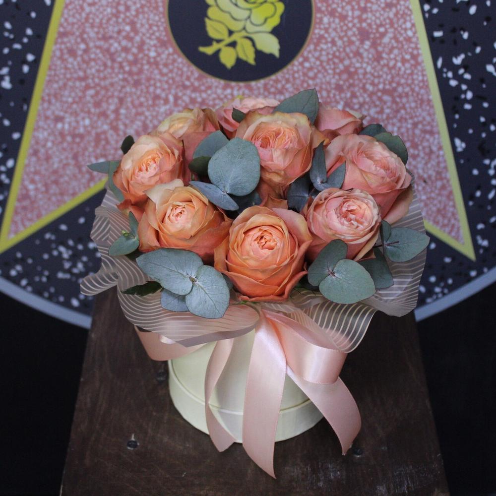Роза пионовидная кахала – 9 шт.Эвкалипт – 3 шт.Оазис флористический – 1 шт.Пленка дизайнерская – 2 шт.Шляпная коробка – 1 шт.