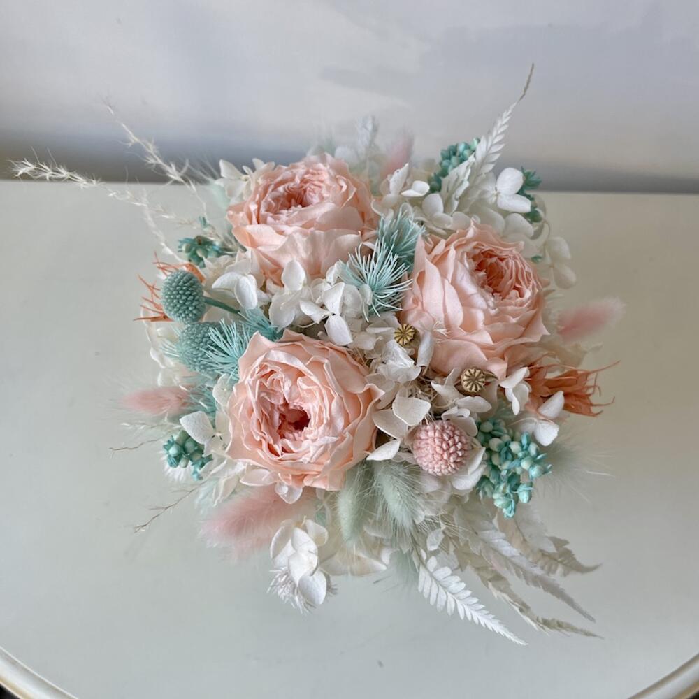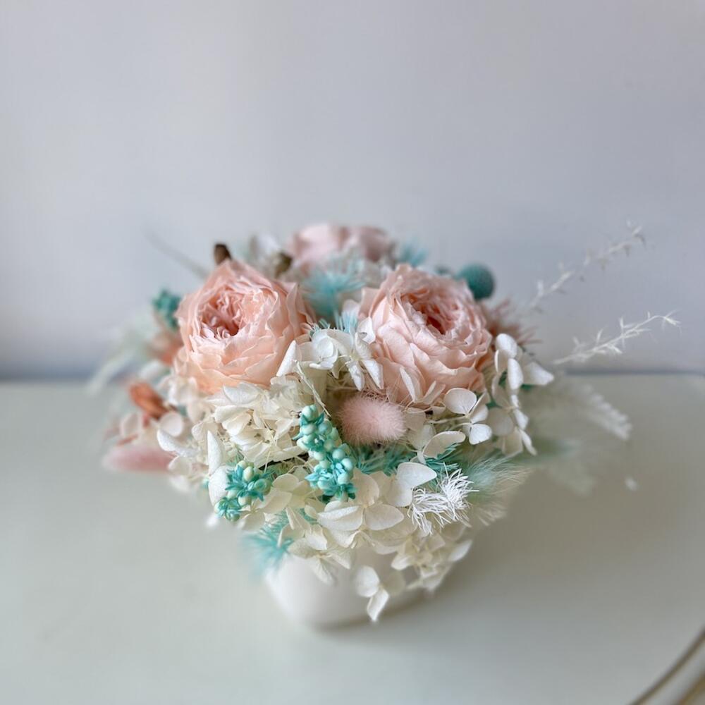 Роза стабилизированная – 3 шт.Краспедия – 3 шт.Лагурус – 10 шт.гортензия стабилизированная – 1 шт.папоротник стабилизированный – 1 шт.Нигелла – 1 шт.цветы микс – 10 шт.Кашпо керамика – 1 шт.Коробка – 1 шт.Лента – 1 шт.