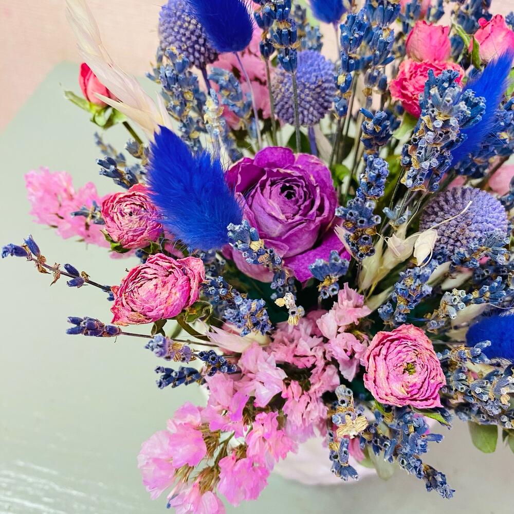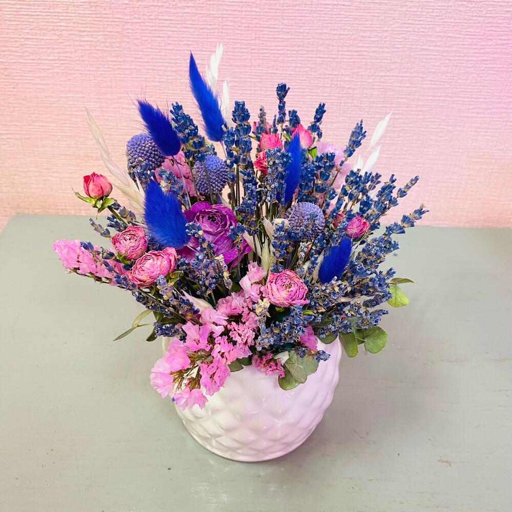 Краспедия – 3 шт.Статица – 1 шт.Лагурус – 5 шт.Лаванда (сухоцвет) пучок – 1 шт.Роза сухоцвет – 2 шт.Кашпо керамическое – 1 шт.Оазис флористический – 1 шт.овес сухоцвет – 2 шт.