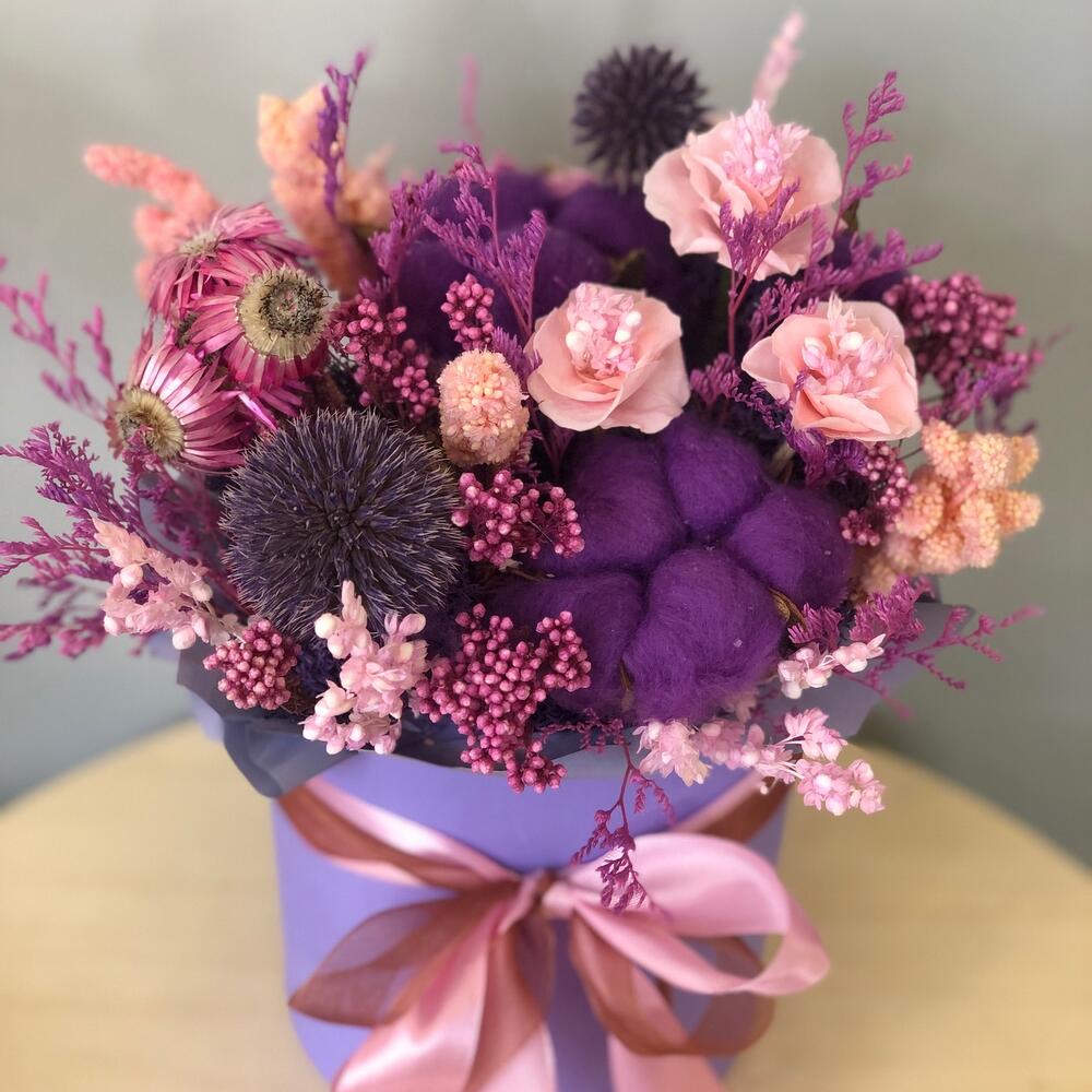 Шляпная коробка – 1 шт.Хлопок – 3 шт.Гелихризум – 1 шт.Эхинопс – 2 шт.сорго – 1 шт.Озотамнус – 1 шт.Лимониум – 1 шт.Роза стабилизированная – 1 шт.Сетария – 2 шт.