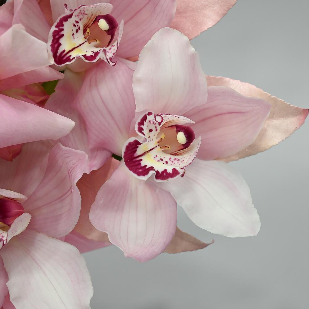 Французская роза – 5 шт.Орхидея Цимбидиум – 3 шт.Хризантема – 1 шт.Эустома – 4 шт.Гвоздика – 5 шт.Пионовидная кустовая роза – 4 шт.Аралия – 1 шт.Амарант – 1 шт.Рускус – 3 шт.