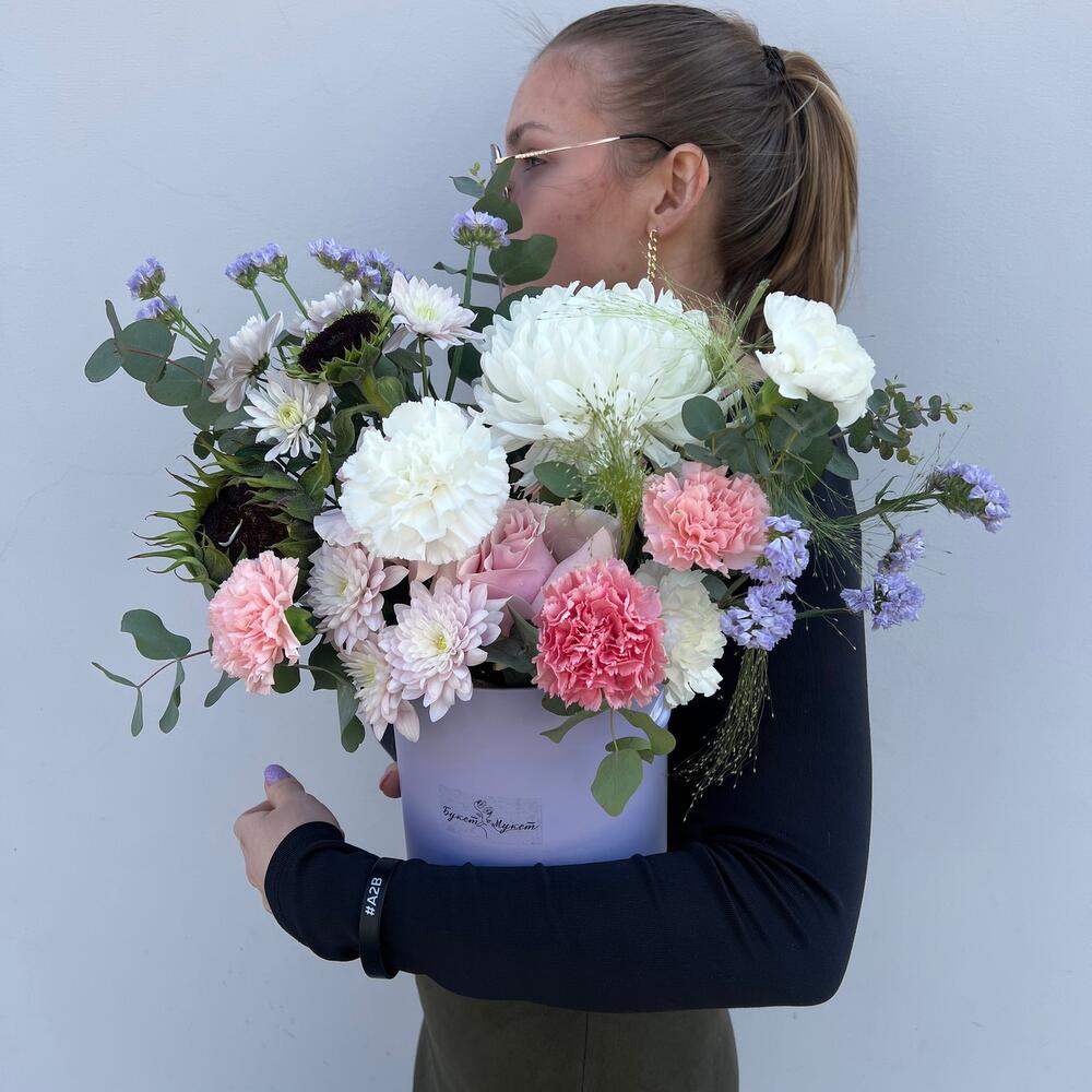 Хризантема Антонов – 1 шт.Диантус – 6 шт.Роза французская – 2 шт.Подсолнух – 2 шт.Паникум – 2 шт.Хризантема Балтика – 1 шт.Статица – 1 шт.Эвкалипт – 1 шт.Оазис флористический – 1 шт.Коробка шляпная – 1 шт.