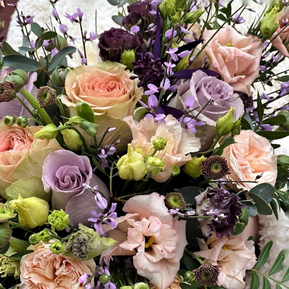 Роза кустовая пионовидная – 3 шт.Роза пионовидная – 2 шт.Роза лавандовая – 4 шт.Лизиантус алиса – 4 шт.Джинстер – 4 шт.Эвкалипт – 4 шт.цветы микс – 4 шт.зелень микс – 4 шт.Коробка – 1 шт.Флористическая губка – 1 шт.Фисташка – 3 шт.Лента – 1 шт.