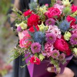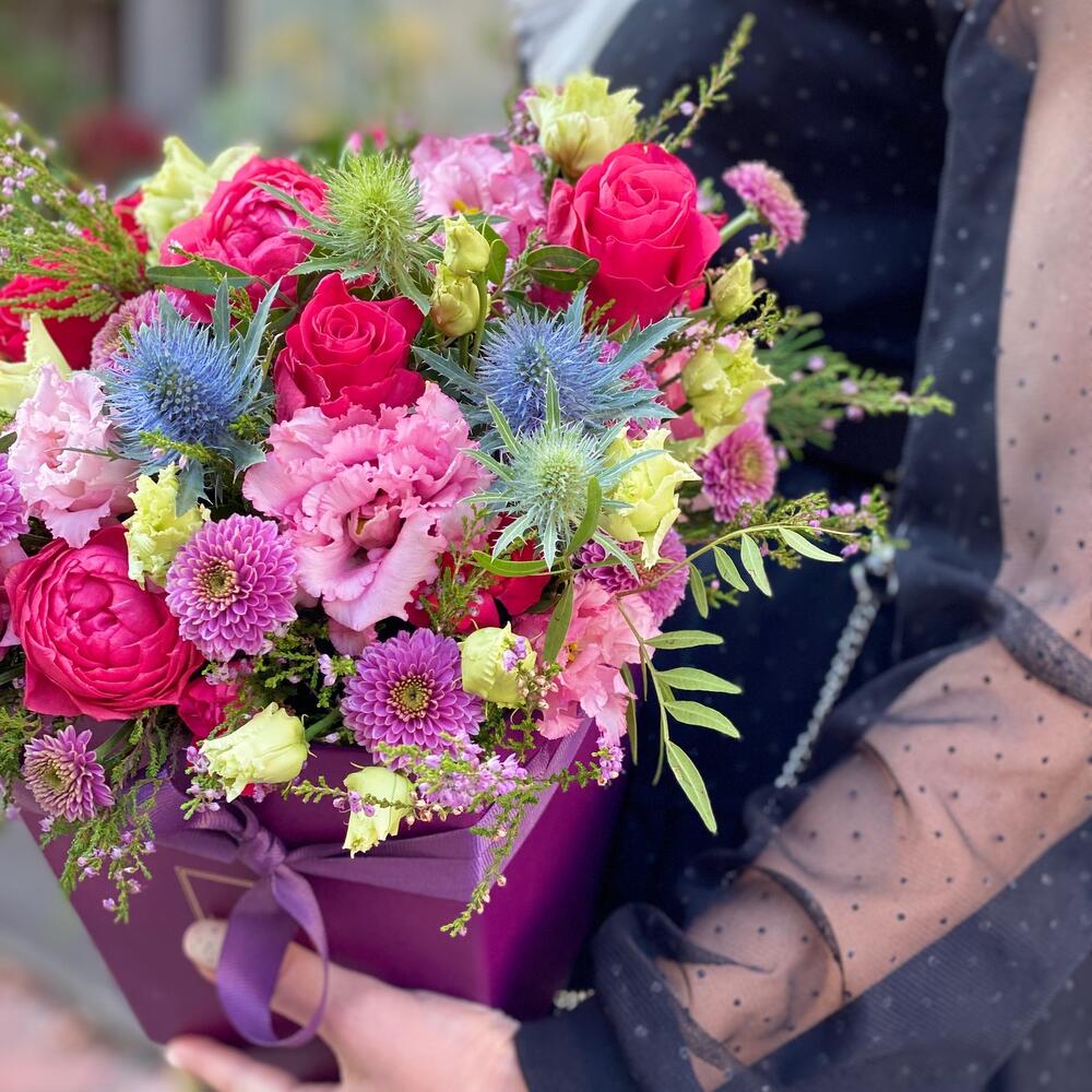 Эрингиум – 1 шт.Роза – 5 шт.Сантини – 2 шт.Коробка – 1 шт.Пионовидная кустовая роза – 2 шт.Оазис флористический – 1 шт.Лизиантус алиса пинк – 3 шт.зелень декоративная – 5 шт.цветы в ассортименте – 5 шт.