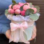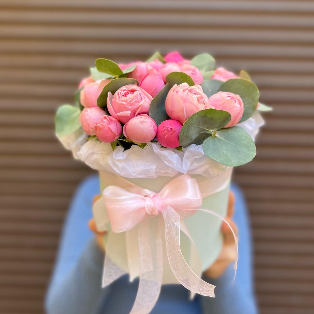 Эвкалипт – 5 шт.Лента атласная – 2 шт.Тишью – 1 шт.Оазис флористический – 1 шт.коробка шляпная s – 1 шт.сильва пинк кустовая роза – 5 шт.