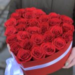 Роза красная – 29 шт. Коробка сердце – 1 шт. атласный бант – 1 шт. Оазис – 2 шт.