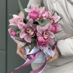 Коробка Тиффани из цимбидиума и кустовых пионовидных роз