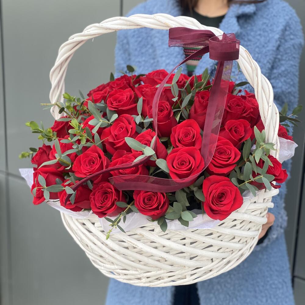 красная роза фридом – 51 шт. Эвкалипт – 3 шт. Корзина – 1 шт. Оазис – 4 шт.