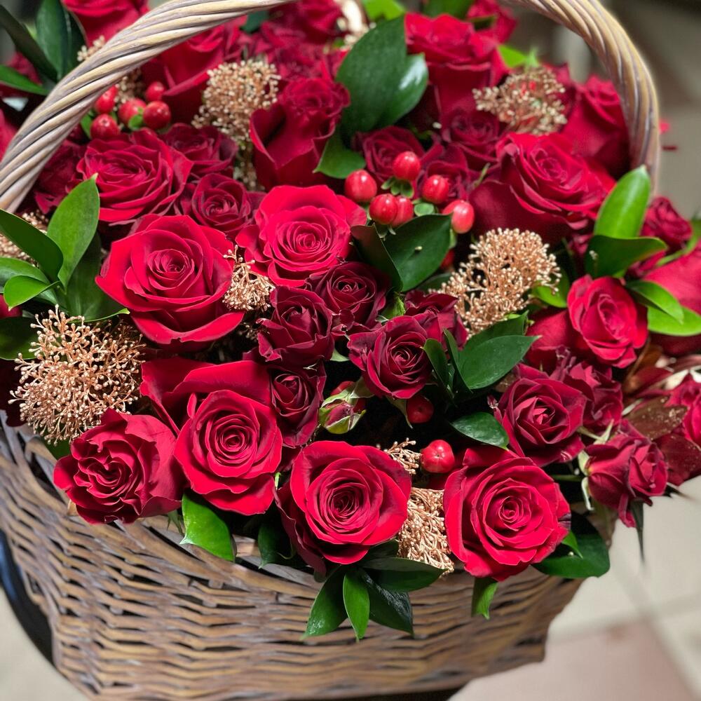 Роза Эквадор – 25 шт. Роза кустовая – 10 шт. Скиммия – 10 шт. Гиперикум красный КУСТОВОЙ – 5 шт. Писташ – 10 шт.