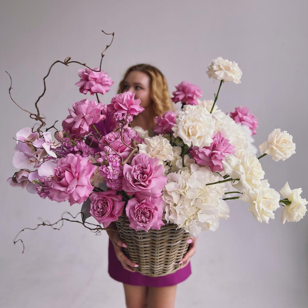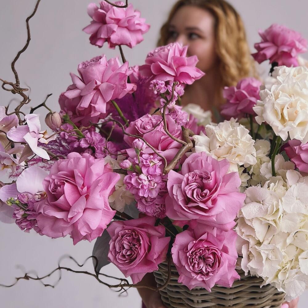 Гортензия – 3 шт.Маттиола – 5 шт.Корилус – 1 шт.Корзина плетеная – 1 шт.Французская роза – 25 шт.Фаленопсис – 1 шт.