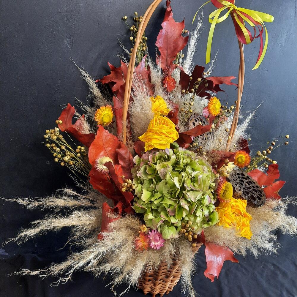 Роза – 3 шт.Лента атласная – 4 шт.Корзина плетеная – 1 шт.Лотос сухой – 2 шт.Оазис флористический – 1 шт.Гелихризум – 15 шт.Дубовые листья – 5 шт.кортадерия – 3 шт.лен пучок – 1 шт.
