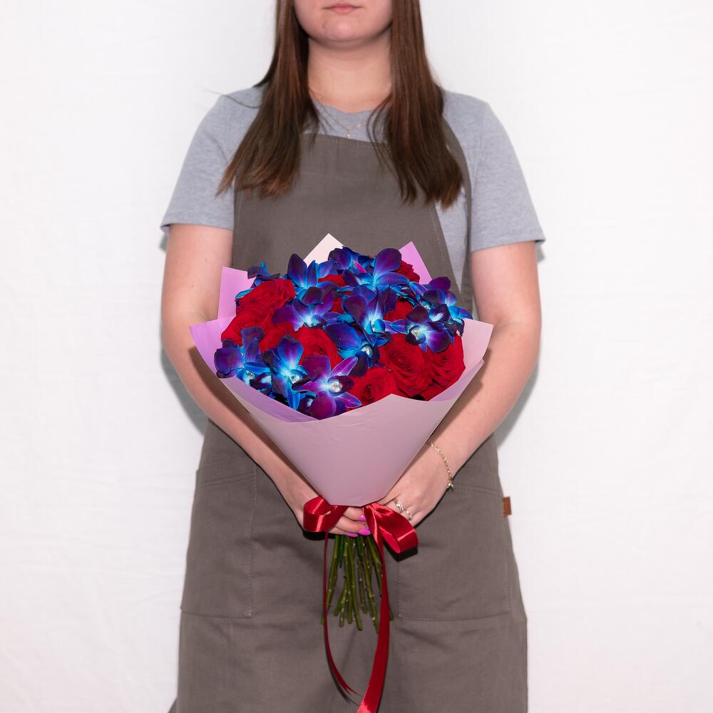 Космические орхидеи с красными розами. Букет 141 ALMOND ROSES