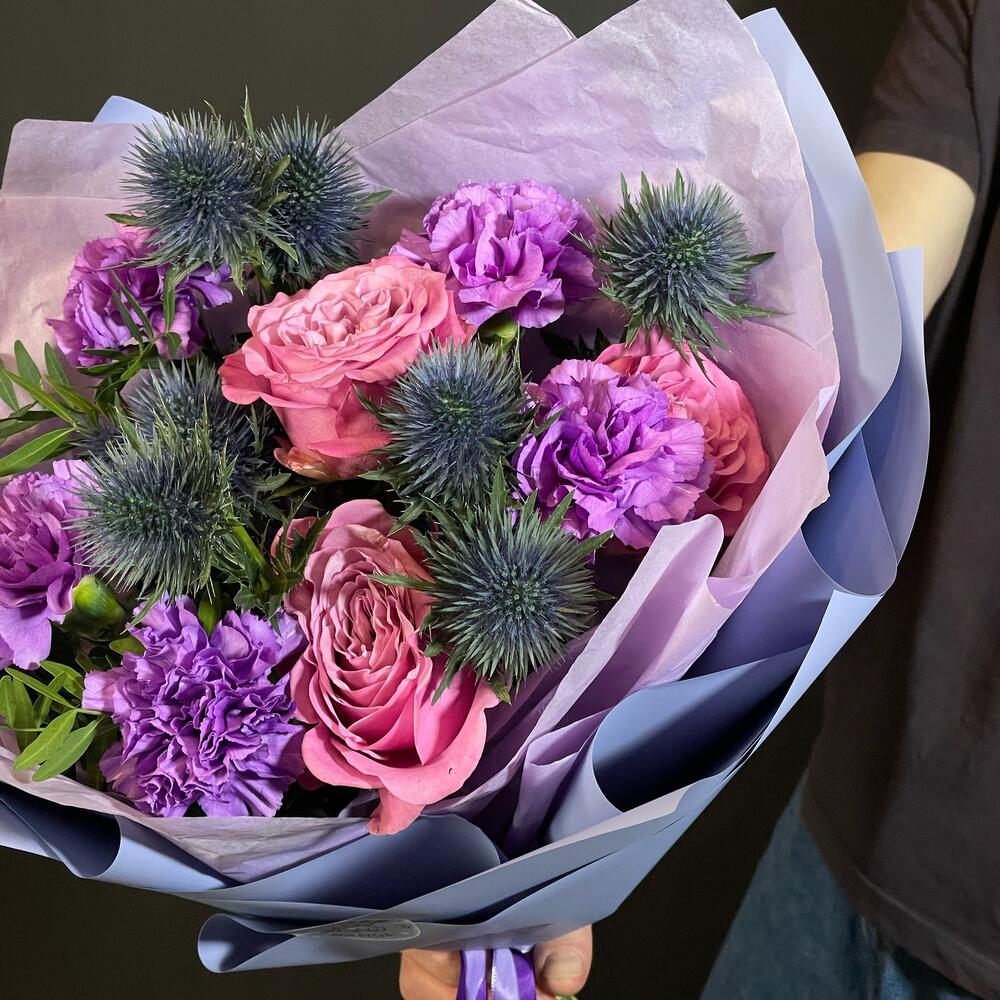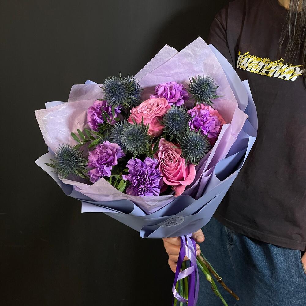 Эрингиум – 2 шт.Роза Эквадор – 3 шт.Гвоздика МунЛайт – 5 шт.Фисташка – 2 шт.Авторская упаковка – 1 шт.