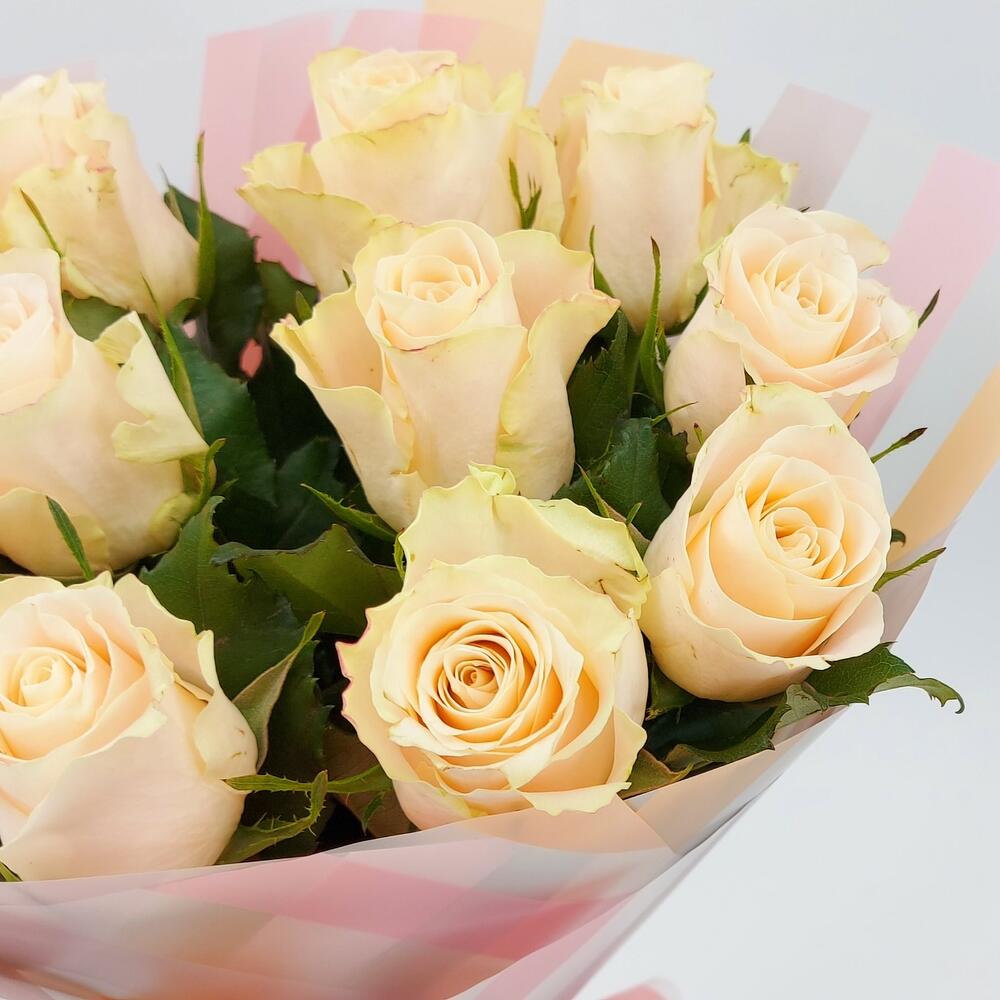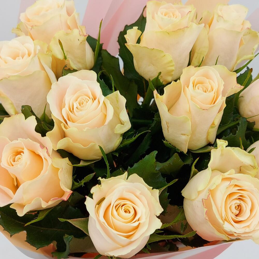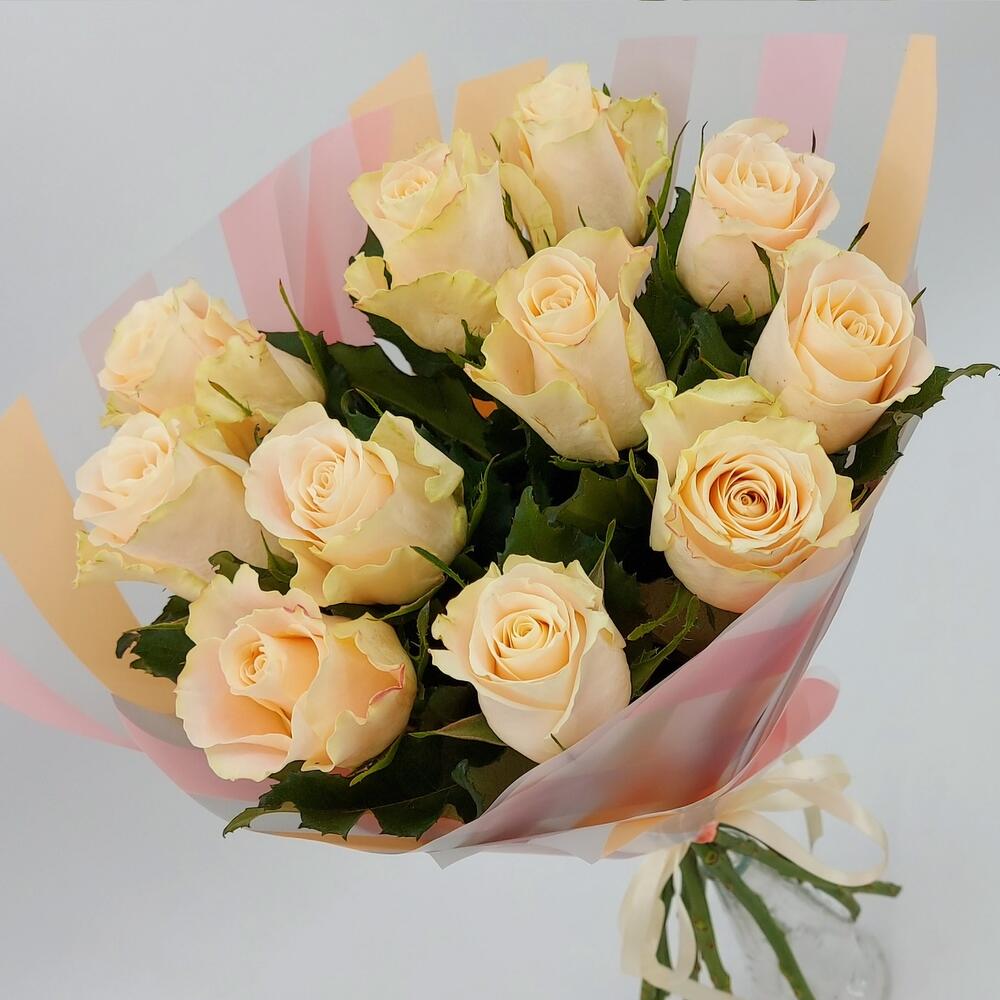 Нежные кремовые розы в стильном монобукете. Такой букет всегда уместен и подойдёт для любого повода: День Рождения, именины, годовщина свадьбы, рождение ребенка, 8 марта, День Святого Валентина, выпускной и т.д. Можно вручить маме, сестре, подруге, коллеге, учителю, любимой.