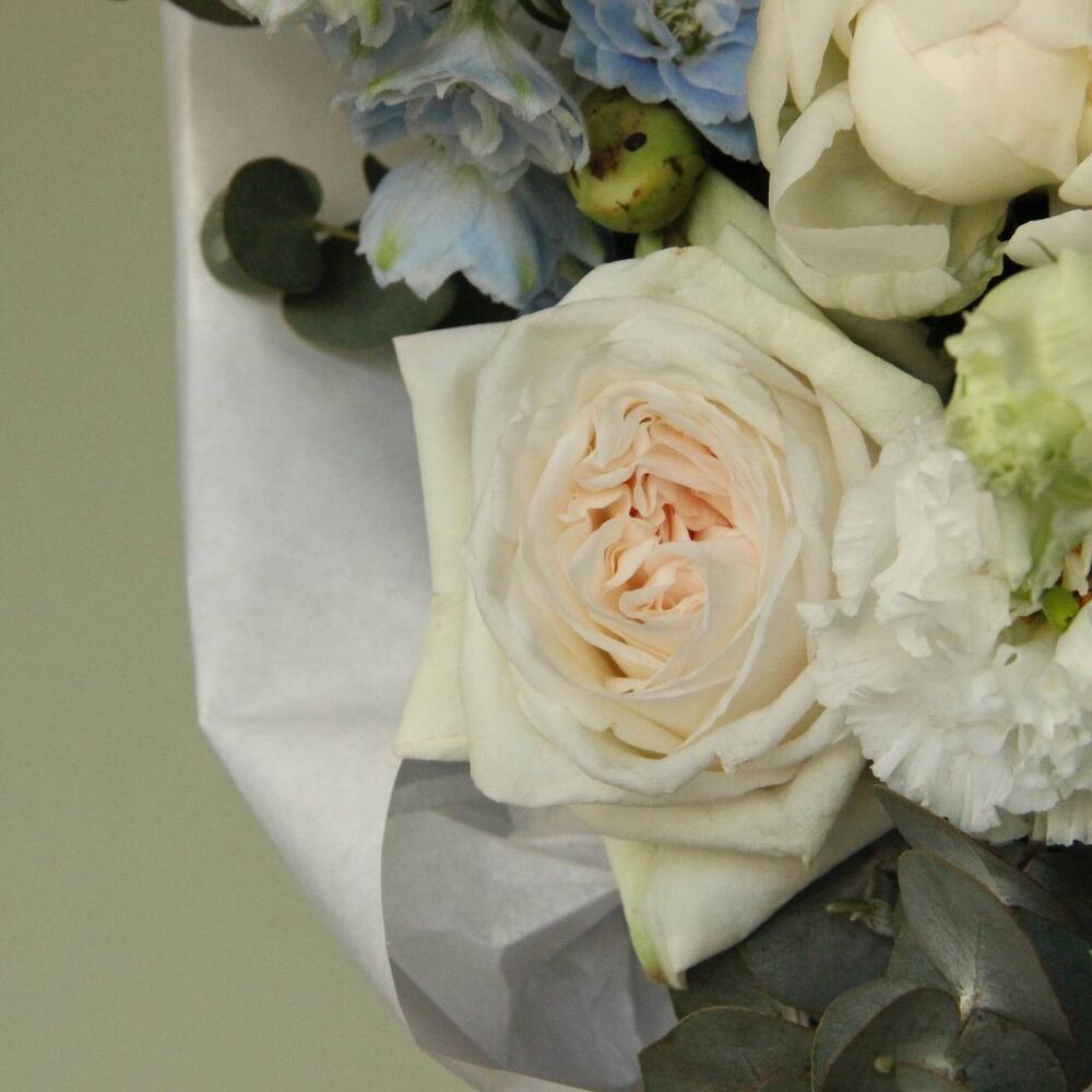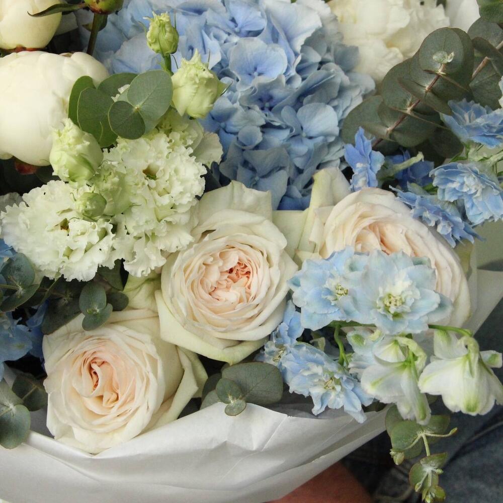 Гортензия – 2 шт.Дельфиниум – 5 шт.Лента – 1 шт.Лизиантус – 5 шт.Пион – 5 шт.Эвкалипт – 5 шт.Упаковка – 1 шт.Фисташка – 3 шт.Роза пионовидная – 5 шт.