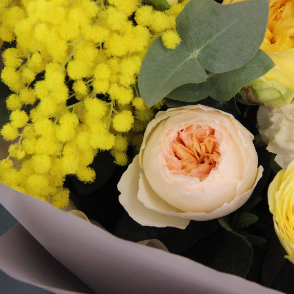 Сухоцветы – 2 шт.Роза кустовая пионовидная – 3 шт.Роза пионовидная – 7 шт.Маттиола – 3 шт.Ранункулюс – 5 шт.Диантус – 5 шт.Эвкалипт – 5 шт.Фисташка – 3 шт.Лента атласная – 3 шт.Упаковка дизайнерская – 3 шт.Мимоза – 2 шт.