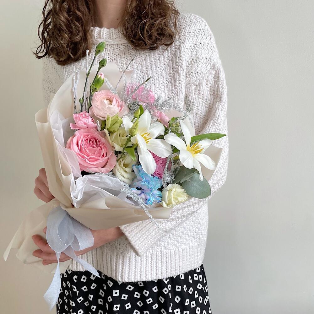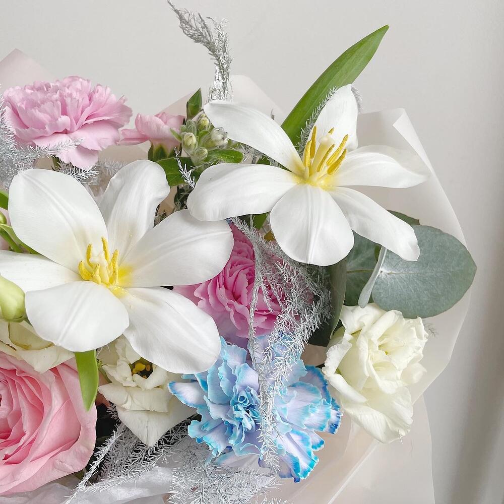 Лизиантус – 1 шт.Тюльпан – 2 шт.Черника – 1 шт.Диантус – 2 шт.Гвоздика кустовая – 1 шт.Аспарагус – 1 шт.Ранункулюс – 1 шт.Пионовидная роза – 1 шт.Оксипеталум – 1 шт.Упаковка дизайнерская – 1 шт.