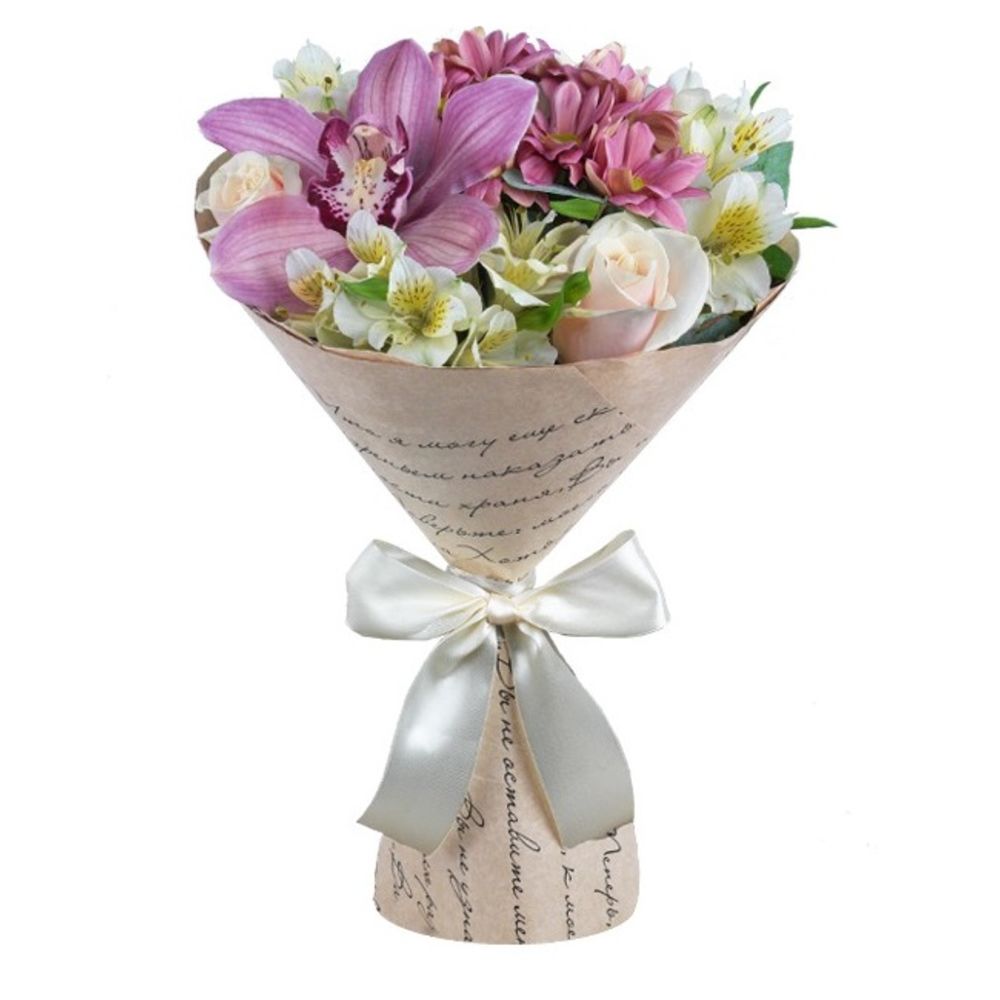 лента декоративная – 1 шт.бумага упаковочная – 1 шт.Эвкалипт – 1 шт.Цимбидиум розовый – 1 шт.Хризантема кустовая розовая – 1 шт.Роза кремовая – 3 шт.Альстромерия кремовая – 3 шт.