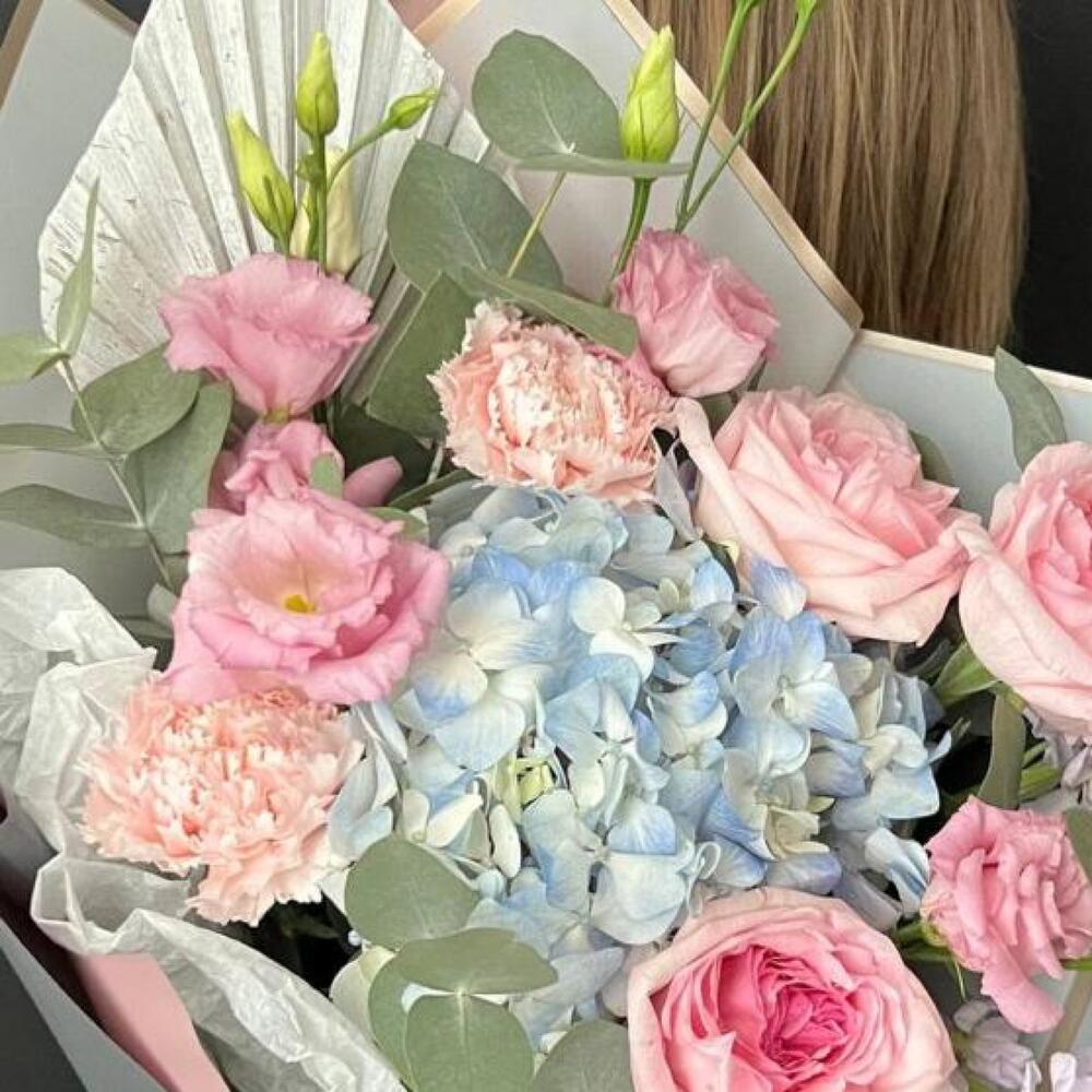 Гортензия – 1 шт.Лизиантус – 2 шт.Маттиола – 2 шт.Эвкалипт – 2 шт.Диантус – 2 шт.Роза пионовидная – 3 шт.Упаковка дизайнерская – 3 шт.Лист пальмы – 1 шт.