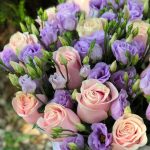 Чудесная композиция в коробке из нежных оттенков роз и лиловых эустом.