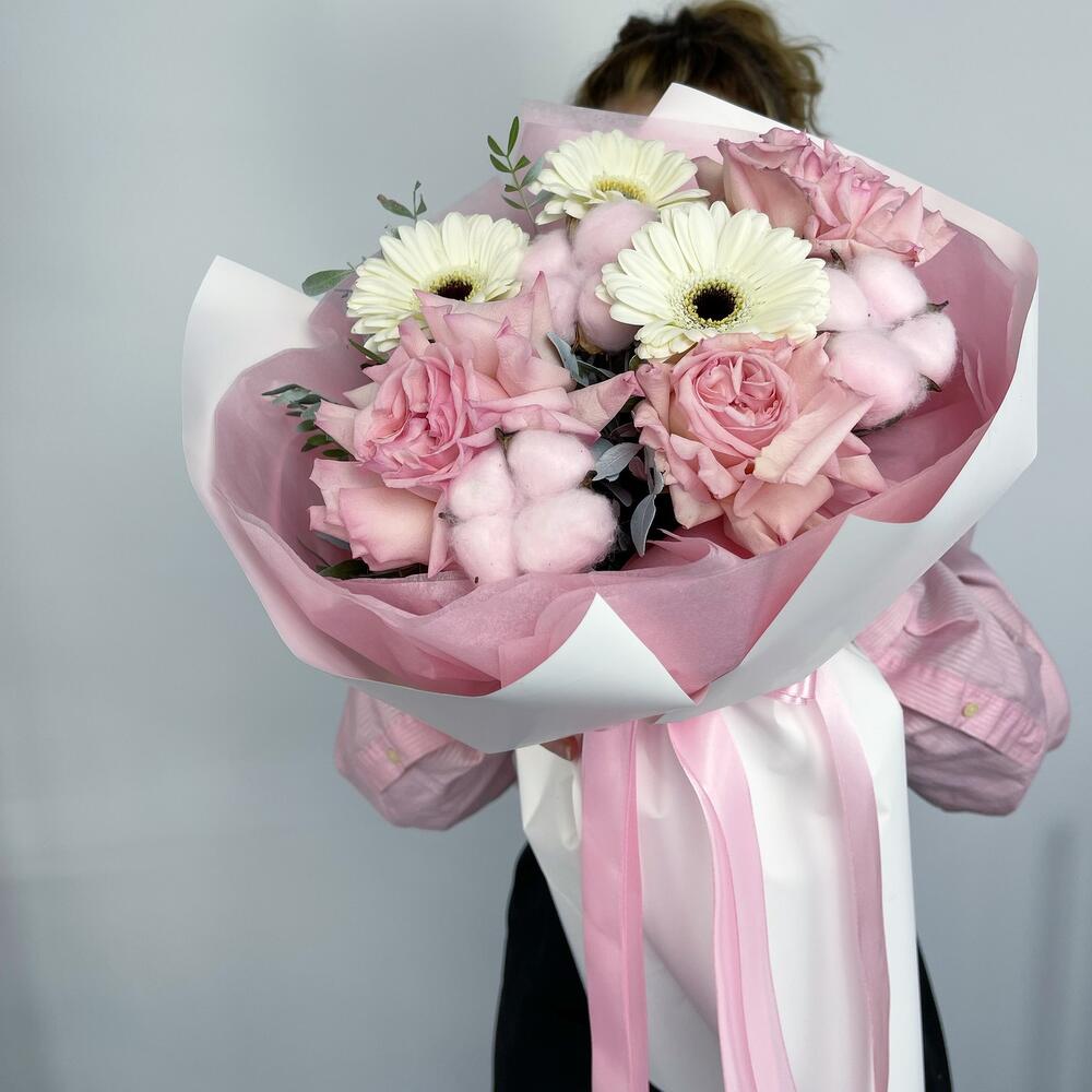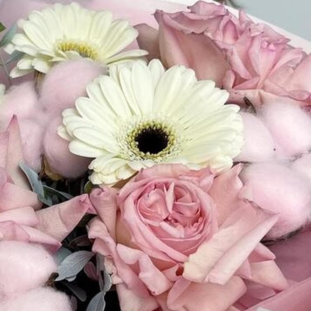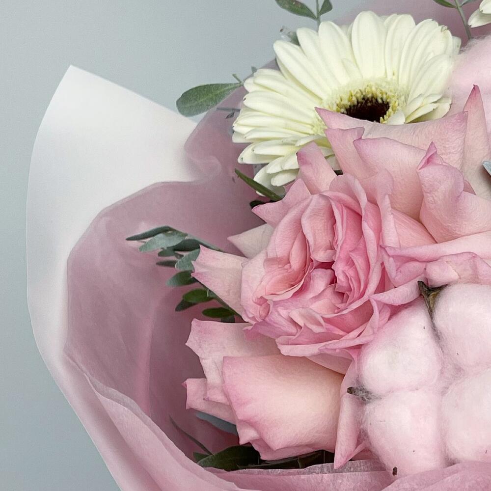 Хлопок – 3 шт.Роза – 3 шт.Лента атласная – 1 шт.Гербера – 3 шт.Фисташка – 1 шт.Пленка матовая – 2 шт.