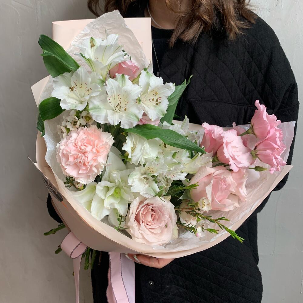 Альстромерия – 2 шт.Лента – 2 шт.Лилия – 1 шт.Фрезия – 1 шт.Роза – 2 шт.Упаковка – 2 шт.Эустома – 1 шт.Диантус – 1 шт.Фисташка – 1 шт.Хамелациум – 1 шт.