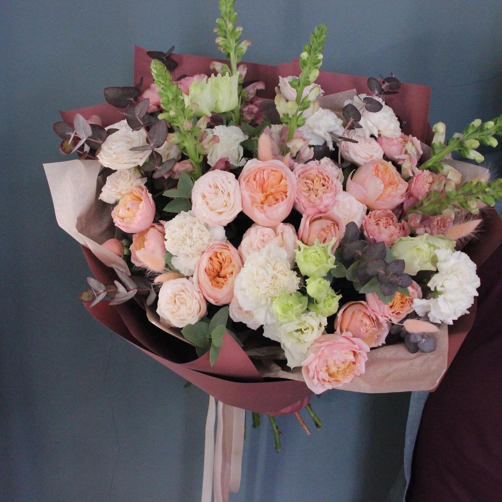 Роза пионовидная кустовая – 4 шт.Роза пионовидная – 3 шт.Львиный зев – 5 шт.Эвкалипт – 5 шт.Диантус – 7 шт.Фисташка – 3 шт.Лизиантус – 4 шт.Тишью – 3 шт.Бумага – 3 шт.Лента атласная – 2 шт.Лагурус – 15 шт.