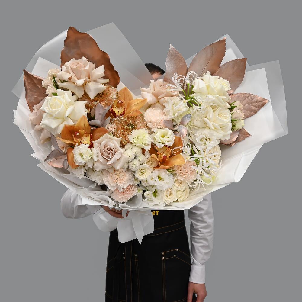 Гортензия – 1 шт.Французская роза – 7 шт.Эустома – 4 шт.Гвоздика – 7 шт.Роза кустовая – 3 шт.Рускус – 7 шт.Хризантема – 3 шт.ЦИМБИДИУМ – 3 шт.Сантини – 4 шт.Нерина – 2 шт.Аралия – 1 шт.Магнолия – 2 шт.Упаковка дизайнерская – 1 шт.