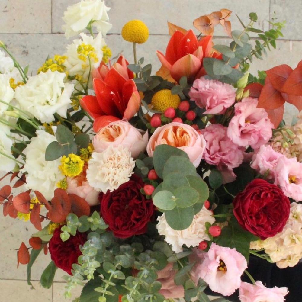 Авторский букет с амариллисами, пионовидными розами, краспедией, хиперикумом, лизиантусом и эвкалиптом.Стильное цветочное решение для любого случая