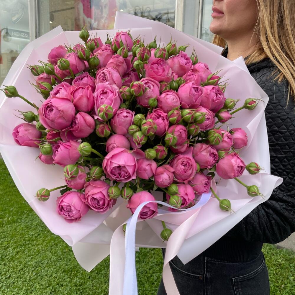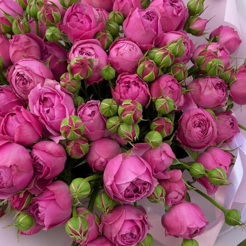 упаковка дизайнерская пленка – 5 шт.бант атласный двойной – 1 шт.пионовидная роза кустовая Misty Bubbles – 19 шт.
