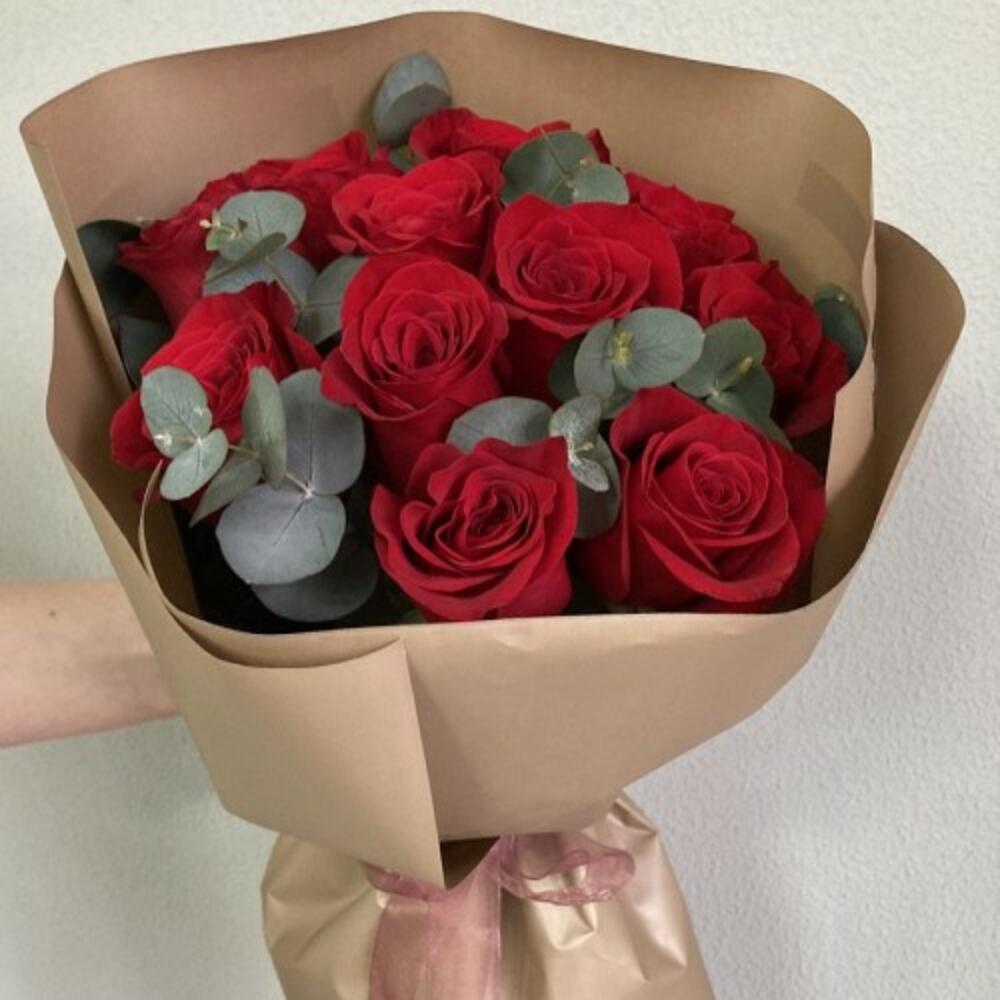 Авторский букет из розовых Пионовидных Роз и Эвкалипта