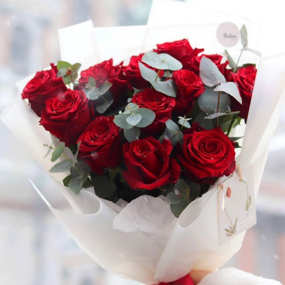 Алые розы в стильном моно букете с ароматным эвкалиптом синереяБукет для настоящих чувств ♥️По вашим пожеланиям добавим: открытку, шоколад ручной работы, конфеты кондитерской фабрики Счастье, воздушные шары