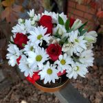 Роза красная – 5 шт. Коробка шляпная – 1 шт. Альстромерия белая – 3 шт. Хризантема белая кустовая – 3 шт.